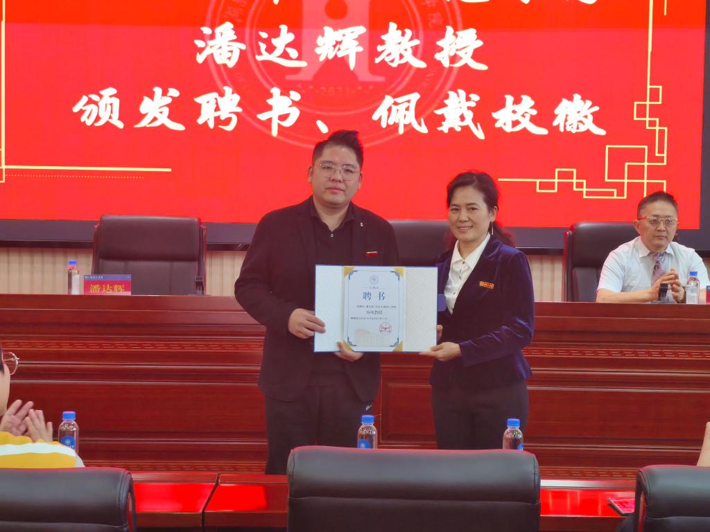 会上,王艳琼为潘达辉佩戴校徽并颁发客座教授聘书,学生代表为潘达辉献上鲜花。